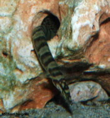 Olivâtre à jaune-olivâtre, maculé de noir sur la tête avec des fasciatures noires, souvent dédoublées, en travers du dos, devenant de grosses taches arrondies postérieurement, empiétant sur la moitié basale de la dorsale molle. Une série latérale de taches noires plus petites, confluentes avec les bandes dorsales sur la partie antérieure du corps, formant des zébrures caractéristiques. Souvent une troisième série de taches foncées le long de l’anale et empiétant sur celle-ci. Régions ventrales pâles, gris-olivâtre, le dessous de la tête, les bas-flancs et la base des pectorales saumon ou jaune pâle. Oeil à pupille cerclée de jaune. Nageoires verticales olivâtres, noircies et bordées de jaune pâle. Pectorales oranges, plus ou moins maculées de noir. |