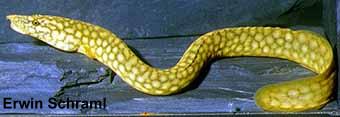 Livrée assez variable, entièrement brun-violacé à brun-beige, uniforme ou ponctuée de jaune-brun clair sur tout le corps, y compris les nageoires verticales, ces points formant des réticulations sur la tête. Les régions ventrales plus claires, jaunâtres ou rosées. Oeil noir, la pupille cerclée de jaune; nageoires verticales de même couleur que le corps, et bordées de clair (jaunâtre). Un mucus de teinte mauve pâle recouvre souvent le corps et la tête. |
