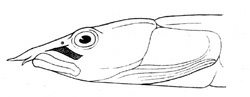 Corps uniforme avec quelques tâches sur la nageoire anale. Marbrures foncées sur la tête avec une bande longitudinale de chaque côté de la tête qui traverse l’œil. Dessus de la tête très sombre. |
